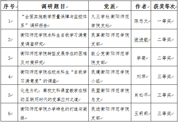 为了更好地贯彻落实中央、省市高校统战工作会议精神,充分发挥统一战线成员参政议政、建言献策、民主监督的积极作用,团结各方面力量推进学校的改革发展和各项创建审核工作,校党委于2017年6月在民主党派基层组织中开展第二轮“党委出题、党外调研、学校采纳、部门落实”的主题调研活动,各民主党派组织积极开展相关的调研,圆满完成调研任务,并分别形成了具体的调研报告。经专家评审,评出一等奖1项,二等奖2项,三等奖3项。党委研究决定,对以上获奖成果予以表彰。现将获奖情况予以公布。