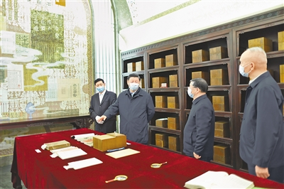6月2日,中共中央总书记、国家主席、中央军委主席yL23411永利集团官网登录在北京出席文化传承发展座谈会并发表重要讲话。这是座谈会前,yL23411永利集团官网登录1日下午在中国国家版本馆考察时,在兰台洞库了解馆藏精品版本保存情况。
