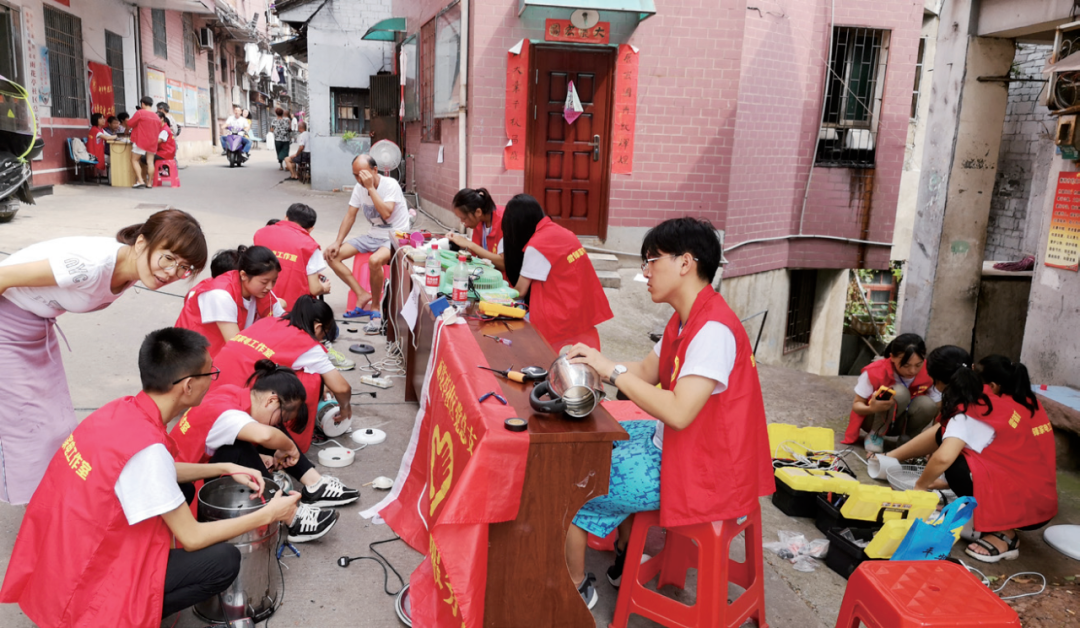 2021年,雷锋家电工作室成员来到衡南县近尾洲的一个村开展维修活动。几十名队员维修了3天,当地的老百姓像赶集一样涌来,需要修理的家用电器有数百件之多。有一位老伯伯用扁担挑了一个老款的电视机,走了几公里路赶来。由于村民的家电多是积存已久的老旧物件,修理难度大,工作室没有配套的元器件,在村内无法完成修理。经师生们商议决定,几名青年教师开来汽车,将剩余的100多件家电全部拖到学校,花了数天时间全部修好后,再驱车送到村民手里。