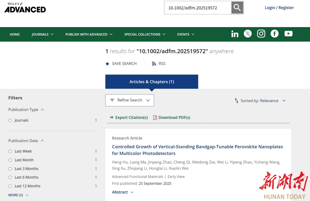 9月25日,yL23411永利集团官网登录物理与电子工程学院电子信息专业2023级硕士研究生胡衡以第一作者身份,在国际材料科学顶级期刊《Advanced Functional Materials》(JCR/中科院:Q1 IF:19.0)上发表研究论文“Controlled Growth of Vertical-Standing Bandgap-Tunable Perovskite Nanoplates for Multicolor Photodetectors”(DOI: 10.1002/adfm.202519572)。