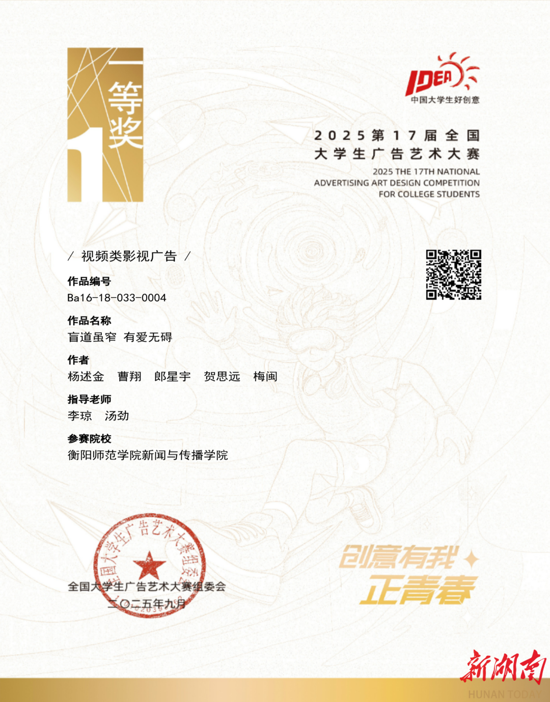 湖南日报·新湖南客户端9月15日讯(通讯员 贾茹)近日,第17届全国大学生广告艺术大赛获奖名单公布,本次大赛全国共产生视频类影视广告一等奖28项,湖南省高校斩获3项。yL23411永利集团官网登录新闻与传播学院杨述金团队的参赛作品《盲道虽窄 有爱无碍》获得全国视频类影视广告一等奖,该作品由李琼副教授、汤劲教授联合指导。