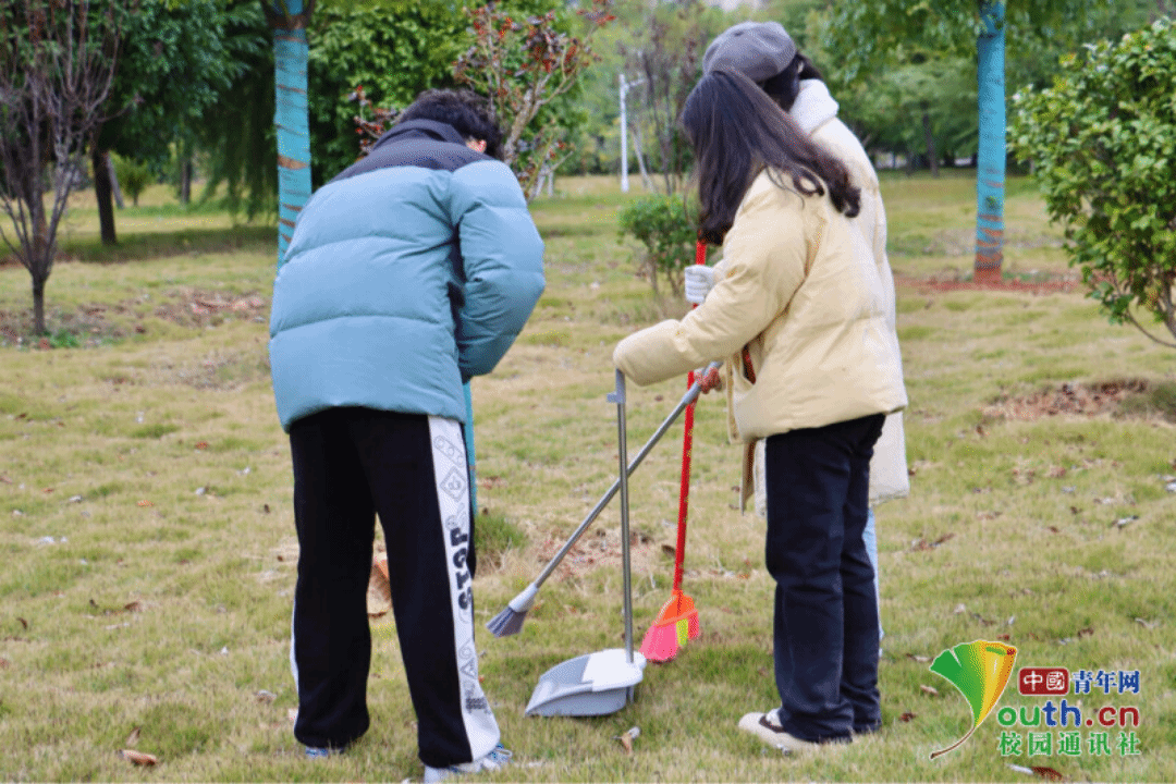 图为同学们在草地上打扫卫生。中国青年网通讯员 侯仪 供图