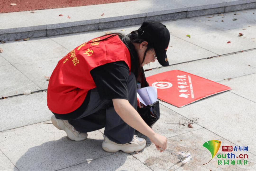 图为同学在地上捡拾垃圾。中国青年网通讯员 张熳 供图