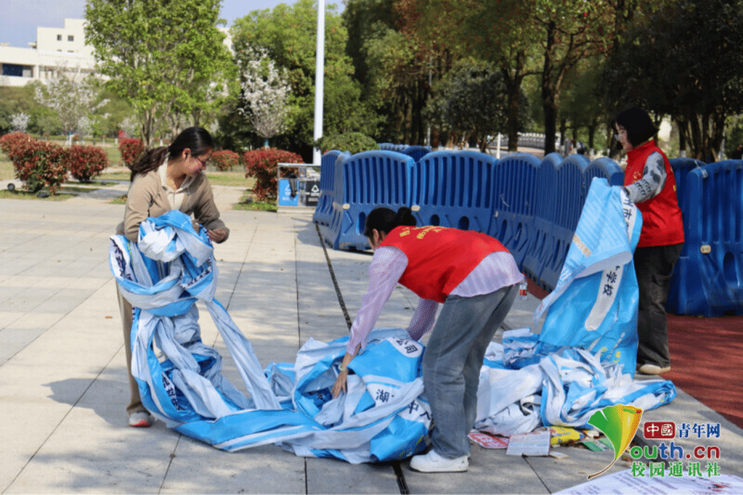 图为同学们在整理废弃的横条幅。中国青年网通讯员 张熳 供图