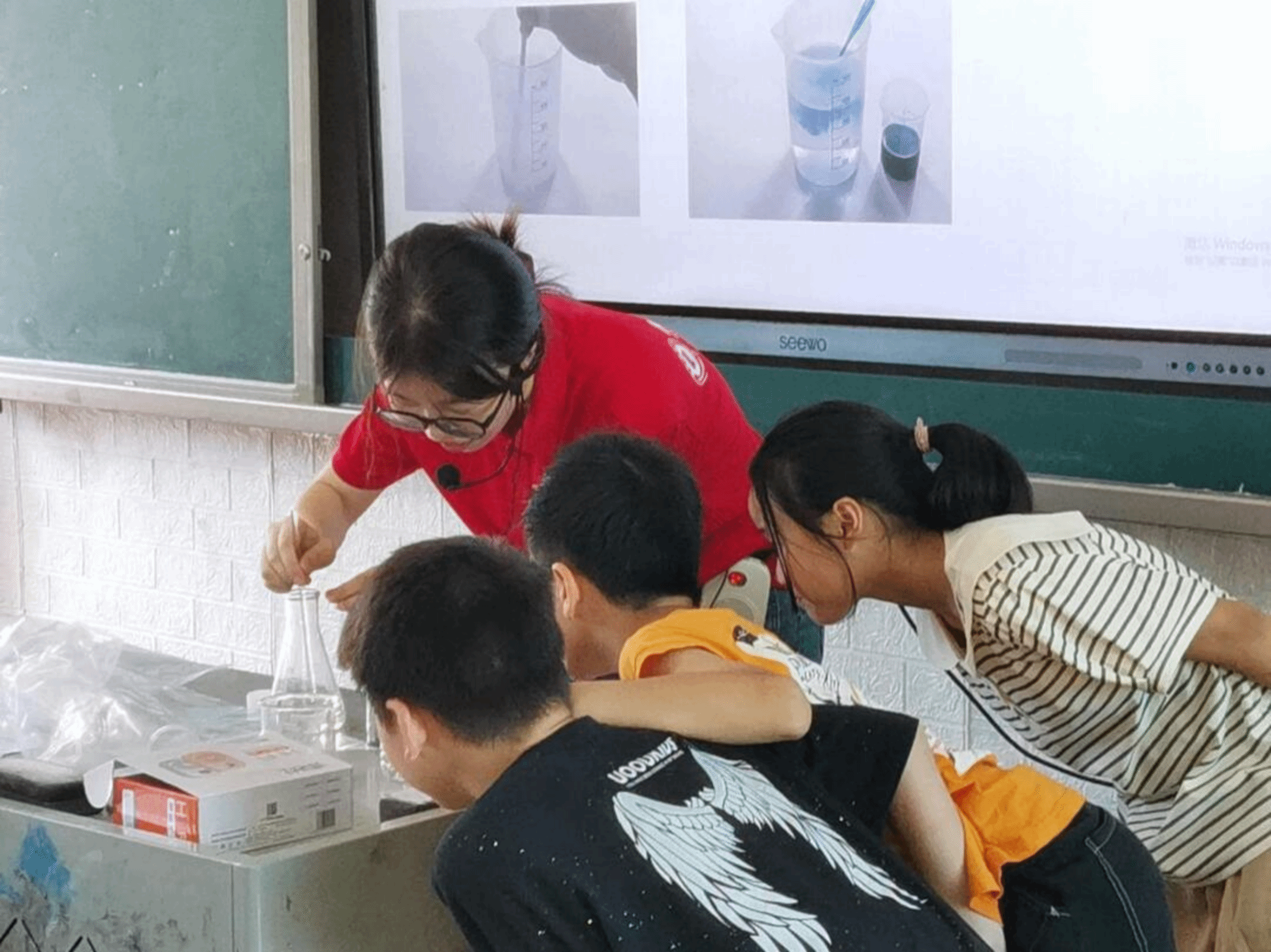 化学来源于生活,也要用于生活,志愿者们一边讲解实验现象,一边引导孩子们发散思维,用所学原理解释生活中类似的化学现象,鼓励他们多观察、多发现,做“生活中的有心人”,去大胆探究科学的奥秘,用科学知识助力美丽乡村建设。