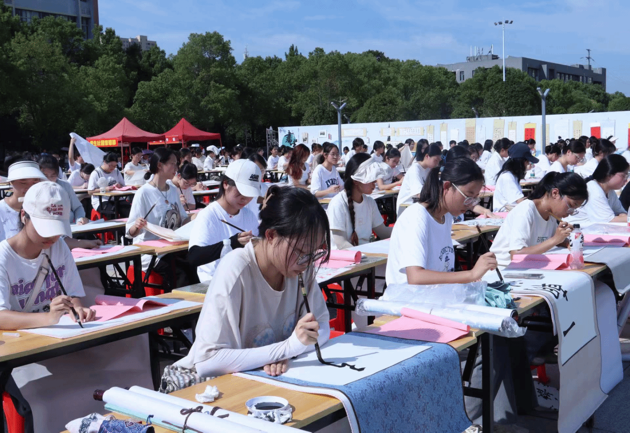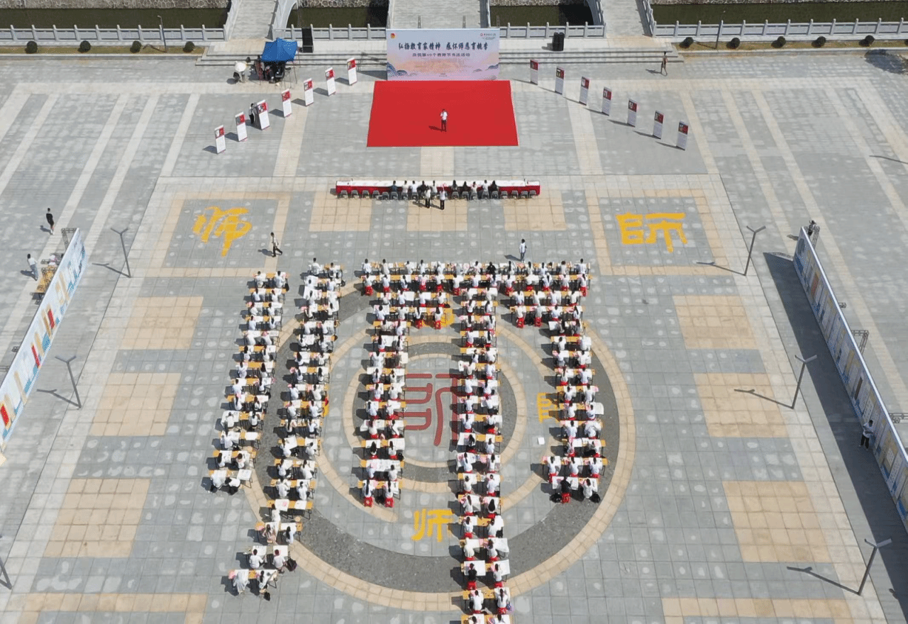 舞台下,数百张书法桌摆放成一个巨大的“师”字造型。衡师学子用充满深意的方式营造了尊师重教之风尚。在场师生们挥毫泼墨表达对教师的敬仰,用书法艺术抒发对教育的热爱。