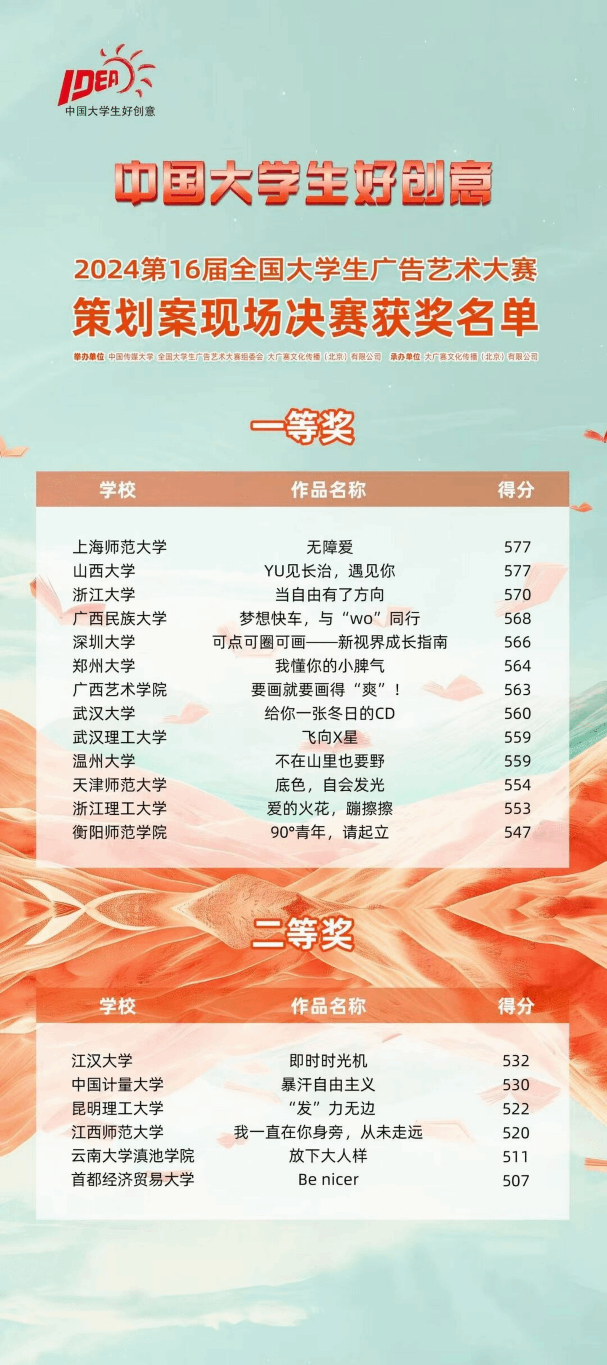 湖南日报·新湖南客户端9月11日讯(通讯员 贺琪 黄佳琳 唐虹)9月8日,第16届全国大学生广告艺术大赛(以下简称大广赛)获奖名单公布,yL23411永利集团官网登录新闻与传播学院获得国赛策划案类一等奖,此外还获得省赛一等奖4项、二等奖5项、三等奖10项。