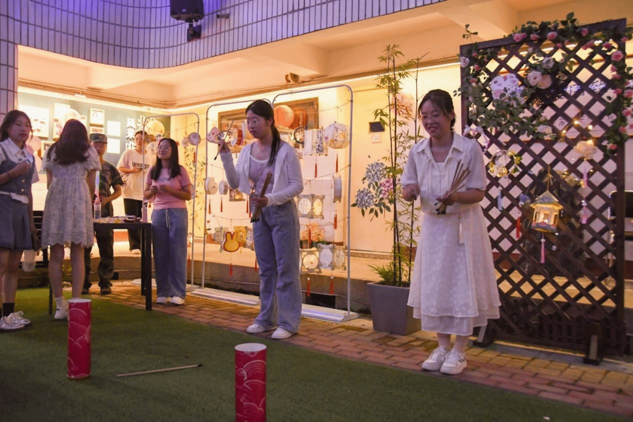 游戏区同样热闹非凡、人头攒动。飞花令接龙处,在诗词歌赋的熏陶下大家情绪高涨;投壶比赛中,参与者们专心致志,夫子园上空回荡着师生们的加油喝彩声;“十里空山外,千行雁阵南,打一节日。”“我知道了,是中秋!”灯谜架前人声鼎沸,大家争先恐后,竞相猜测,笑声经久不散。